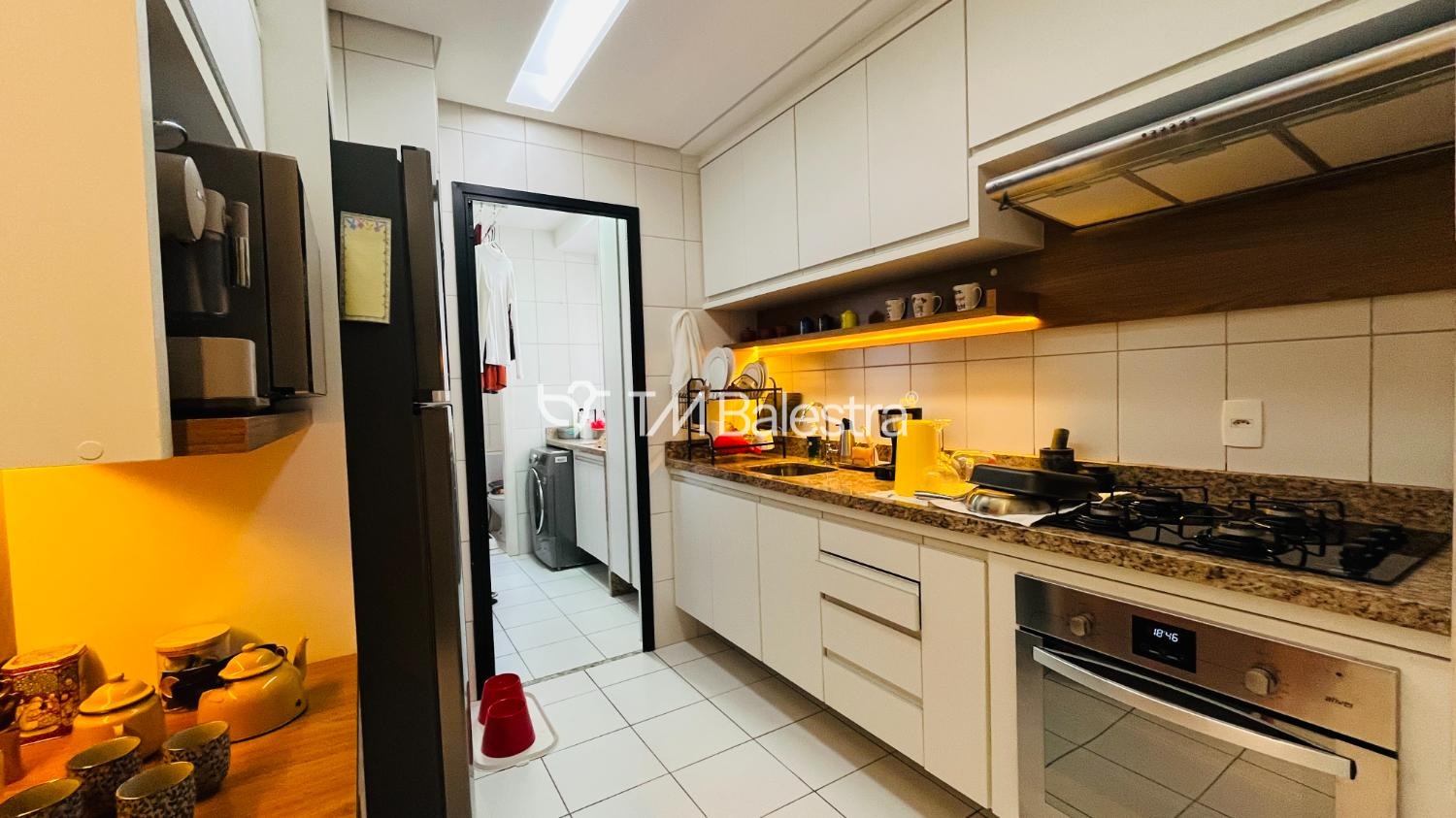 Cozinha planejada moderna, área de serviço funcional e banheiro de serviço.
